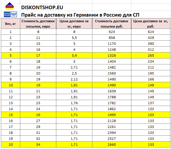 Доставка считается по тарифам СП. При заказе от 499 евро. при весе посылки до 20-ти кг - бесплатная доставка